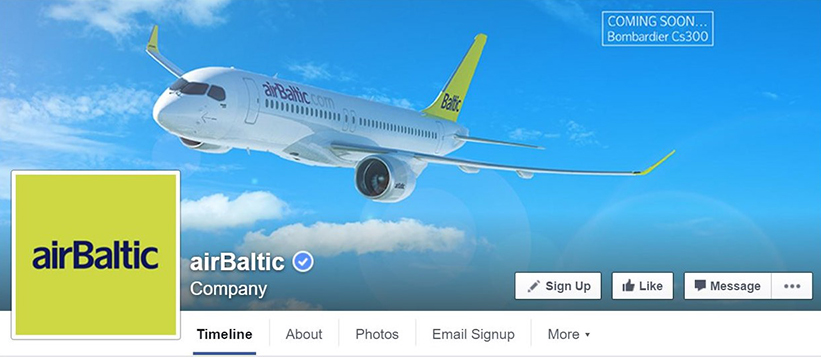 AirBalticu Facebooki profiili värvid mõjuvad tagasihoidlikult ja mahedalt. Tugevamat helerohelist on sinise taeva taustal täpselt õigetes kogustes, mis toob esile brändi logo, kuid ei mõju liiga karjuvalt.