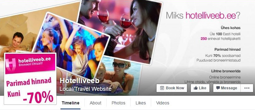 Hotelliveeb on kasutanud nii profiili- kui ka kaanepildil teksti oma pakkumiste kirjeldamiseks. Profiilipildil domineerivat “-70% allahindlust” on võimatu mitte märgata.