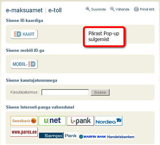 Kuid sellega veel kannatuste rada ei lõppenud. Kui olin ühel neist viitel vajutanud, jõudsin sisenemise lehele, mis pani tõsiselt kukalt kratsima. Esialgu jäi mulje, et nüüd on võimalik e-maksuametisse siseneda ainult ID-kaardi või mobiil-ID abil. Teised sisenemise võimalused kattis pop-up element lihtsalt ära.
