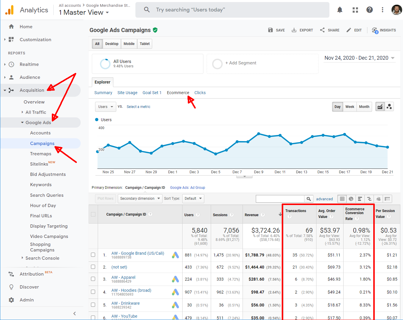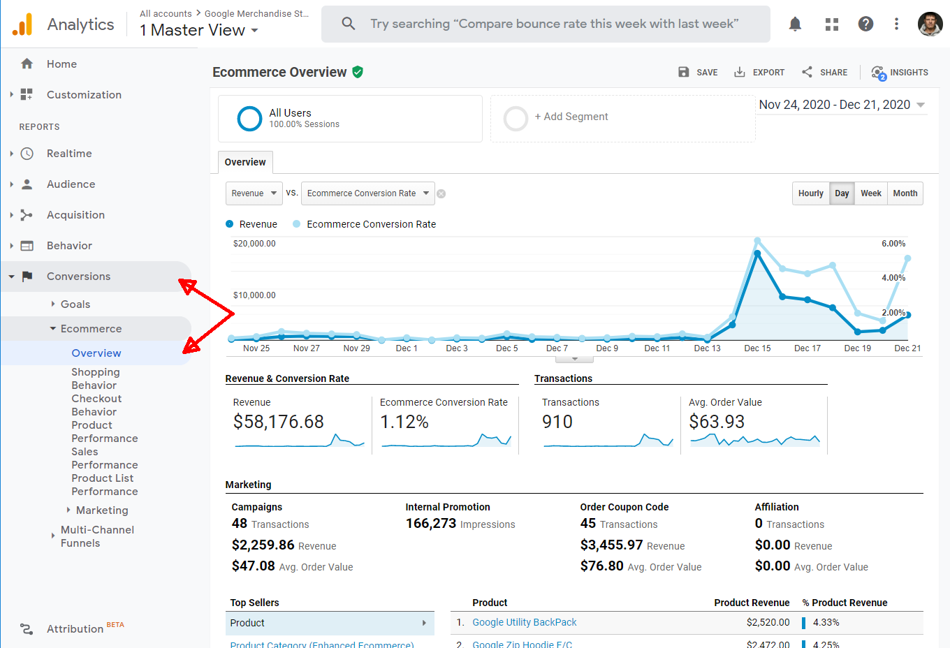 E-commerce trackeri peamine kasu tuleb välja müügiandmete kasutamisel erinevate raportite analüüsimisel. Järgnevalt loetlen olulisemad raportid, mida regulaarselt jälgida, järjestatuna vastavalt sellele, kuidas nad Google Analyticsi menüüs esitatud on.