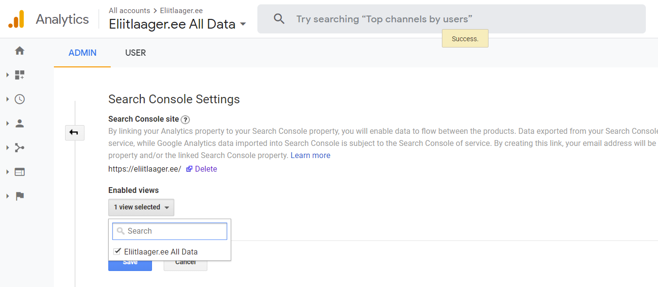 Kui domeen on Google Search Consoles Analyticsi kaudu registreeritud, siis näed seda kohe ka Analyticsi poolel.