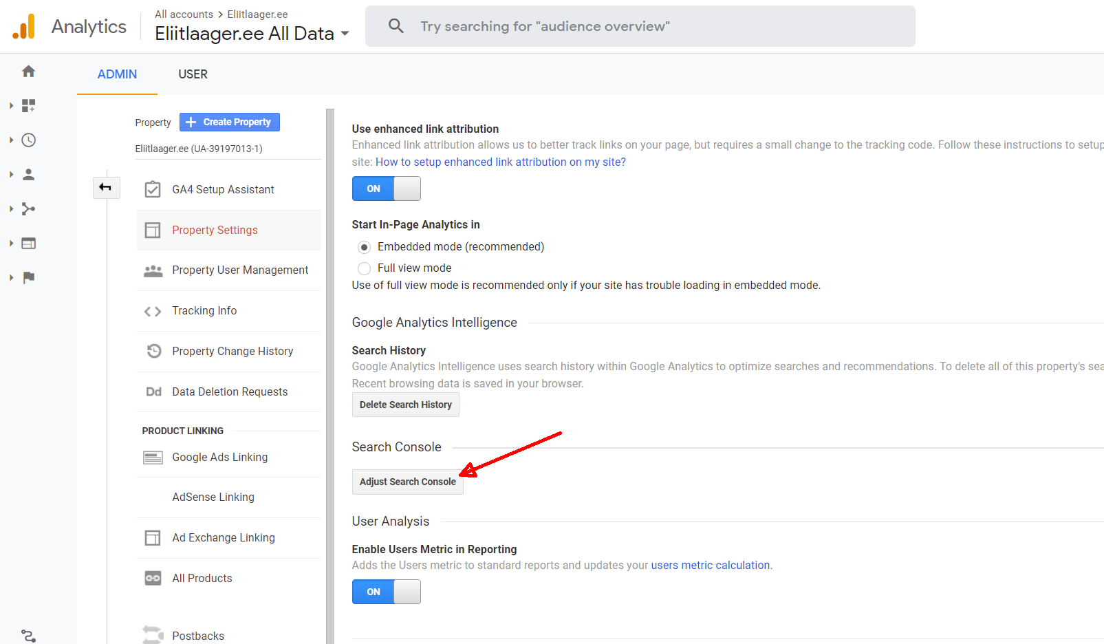 Klikki nupul „Set up Search Console data sharing“. Satud adminpaneelis „Property Settings“ seadetesse. Keri päris lõppu ja seal näed „Search Console“ alajaotust. Kliki „Adjust Search Console“